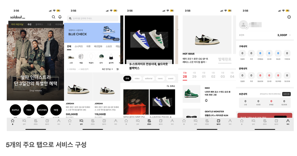 솔드아웃은 2가지의 목적을 5가지의 탭에 포함시켜서 User가 찾아보기 쉽게 만들었다