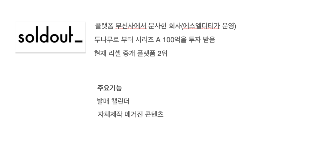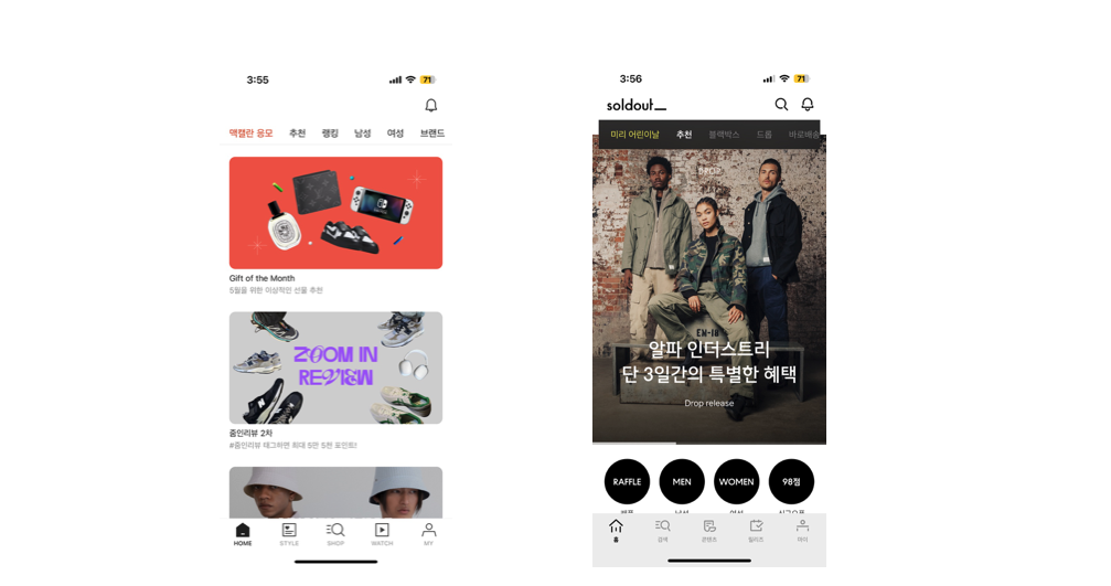 반면 솔드아웃은 상품이 아닌 '그들만의 이벤트'를 User에게 홍보 목적으로 접근한다. 이는 이커머스가 추구하는 판매라는 목적 보다는 홍보에 중점을 둔 인상을 받았다