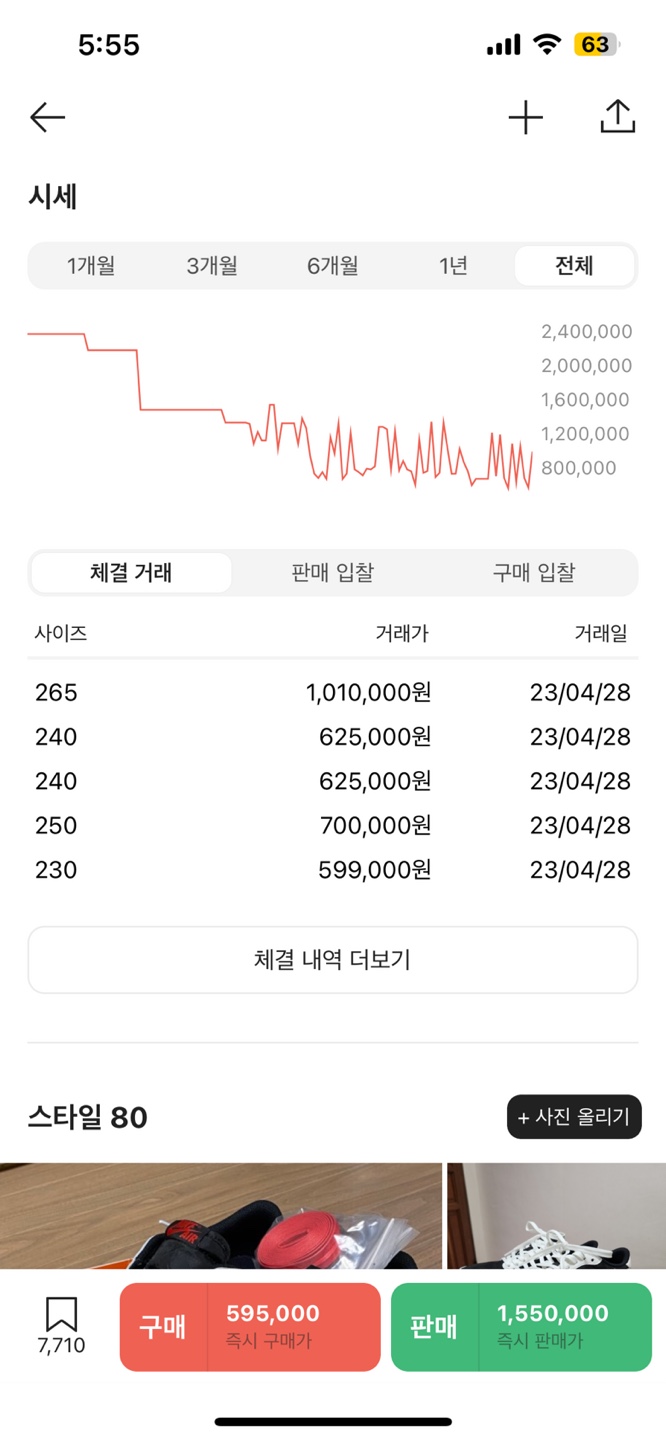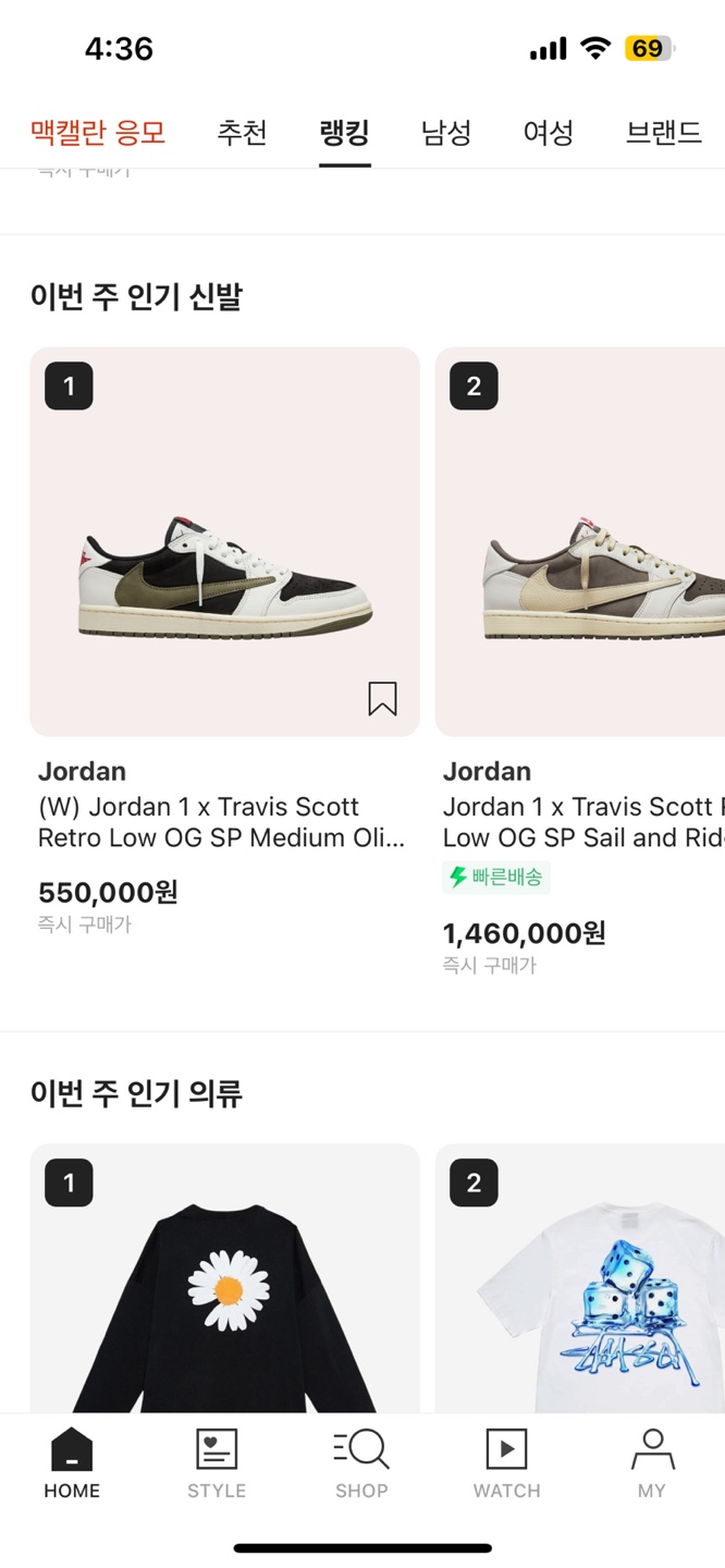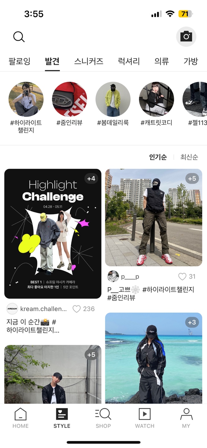 큰 차이점은 크림의 경우 자체 스타일 탭에서 볼 수 있듯이 SNS 기능이 활성화되어 있어서 User들이 올린 상품 사진을 볼 수 있어서 솔드아웃에 비해 구매를 하기 전에 실물 사진을 볼 수 있다