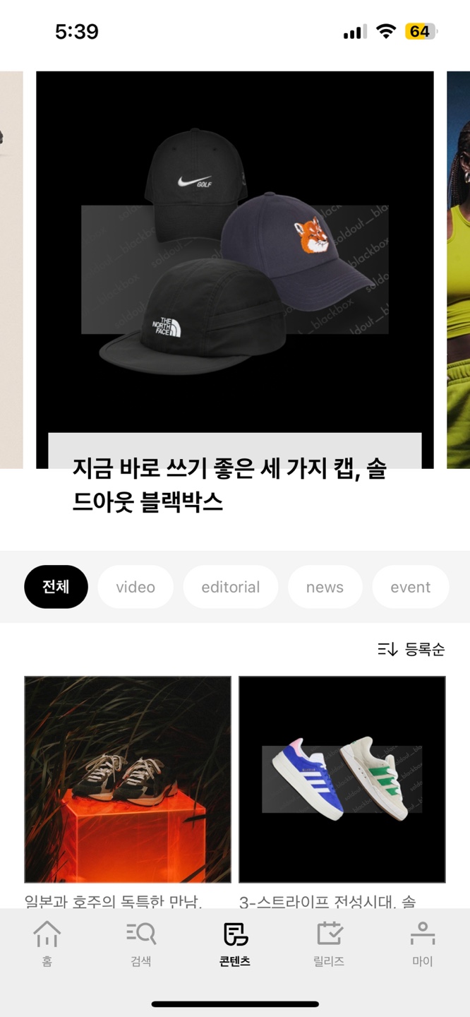 반면 솔드아웃은 솔드아웃의 강점인 자체 콘텐츠를 콘텐츠 텝에서 볼 수 있는데 크림과 다르게 비디오, 뉴스, 이벤트, 에디터가 쓴 컬럼 등을 볼 수 있어서 패션에 관심이 많은 User의 경우 양질의 정보를 얻을 수 있는 탭이었다