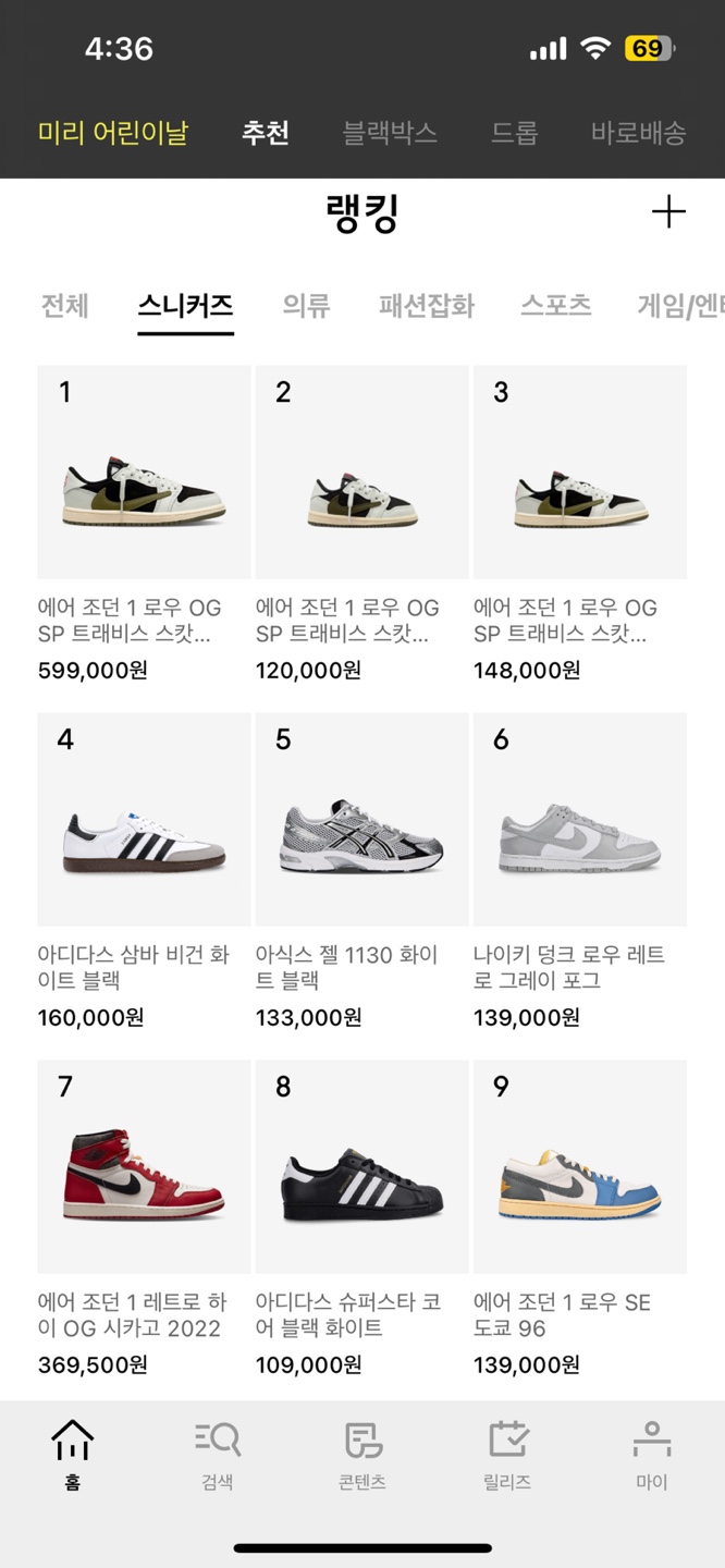솔드아웃의 경우 실시간 랭킹을 홈 화면에서 스크롤을 내리면 보인다. 하지만 크림은 Header Menu로 랭킹을 올리는 대신 홈 화면에 나타내지 않았다. 이는 솔드아웃이 랭킹순으로 보기 더 쉬웠다. 하지만 처음 홈 화면이 나타났을 때 스크롤을 안할 수 있는 가능성이 있기 때문에 Header Menu에 랭킹의 접근성이 개인적으로 더 좋다
