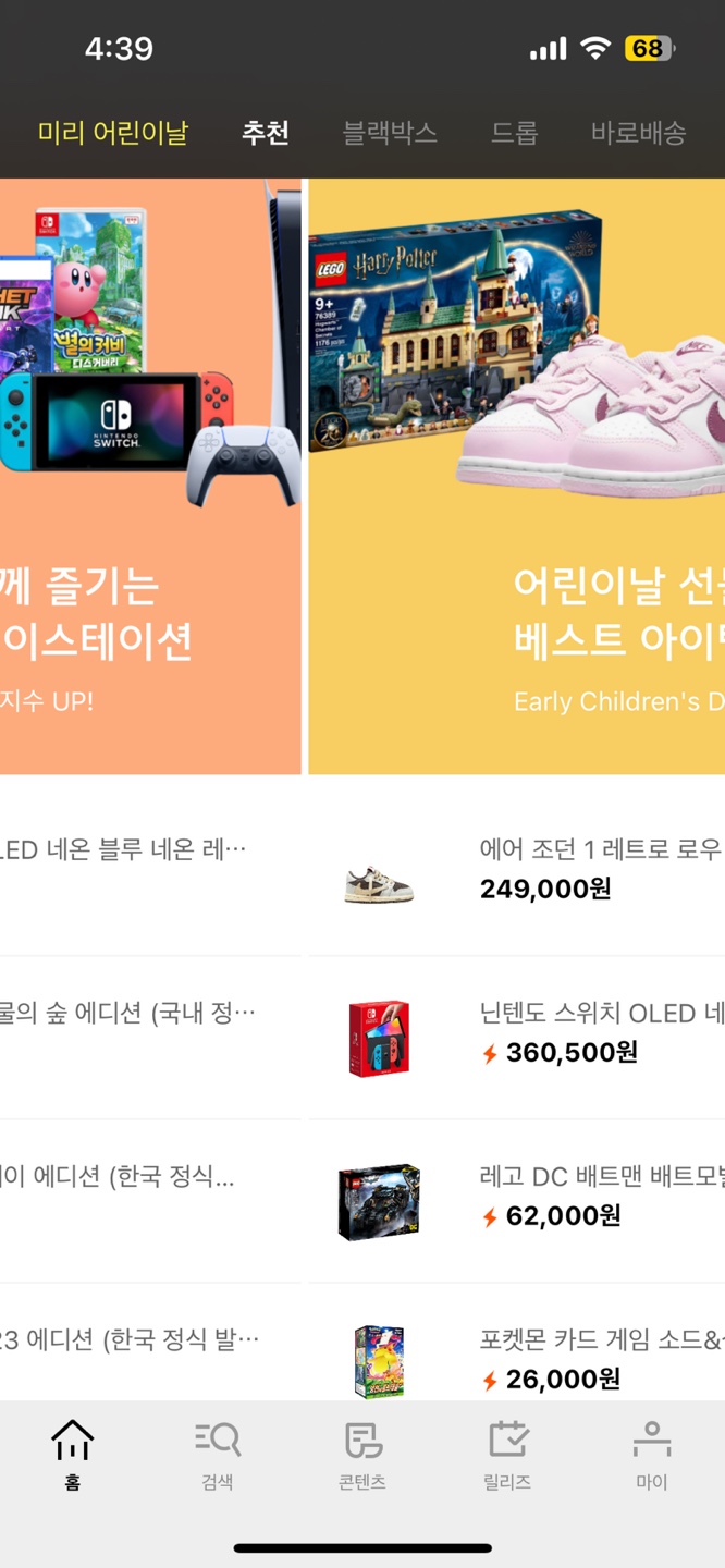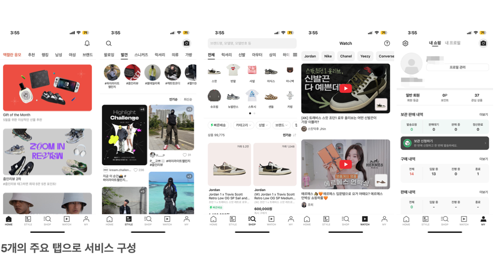 홈 화면을 봤을 때 크림의 경우 ‘SHOP’이라 명확하게 표시를 해줬다