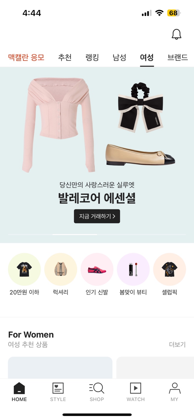 반면 크림은 위에 Header Menu에서 여성탭으로 옮기면 홈화면에서 뷰 위에 뷰가 쌓이는 구조가 아닌 화면 전환이 발생한다