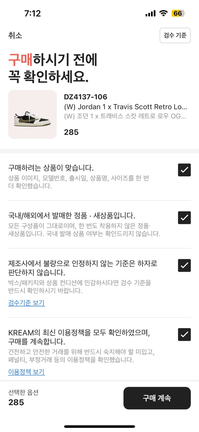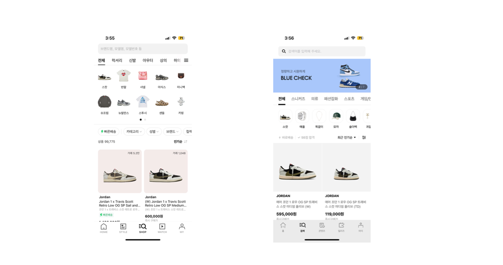 이 두 앱은 구매화면은 똑같았지만 크림의 경우 구매 전 검수사항을 User에게 각인시키는 차이점이 있었다
