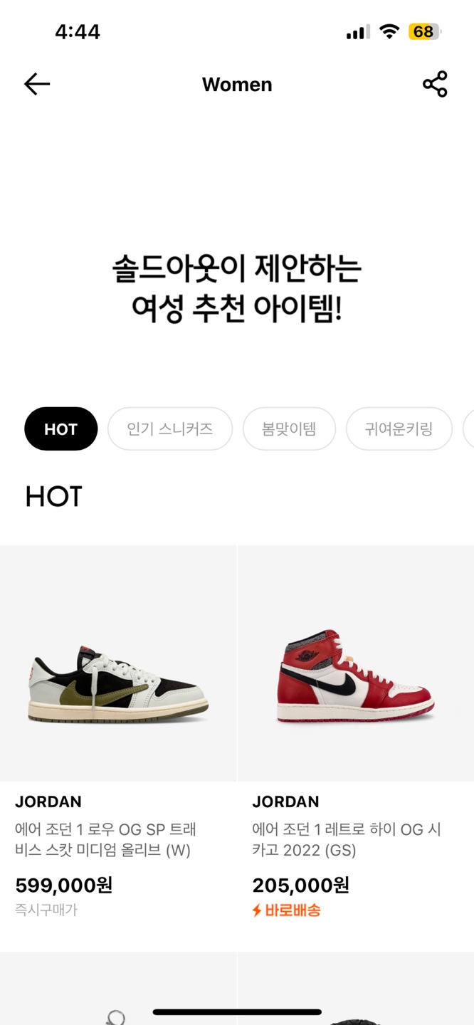 단, 크림에서 버튼으로 여성탭을 눌렀을 경우 솔드아웃과 똑같은 형식의 뷰가 나타난다