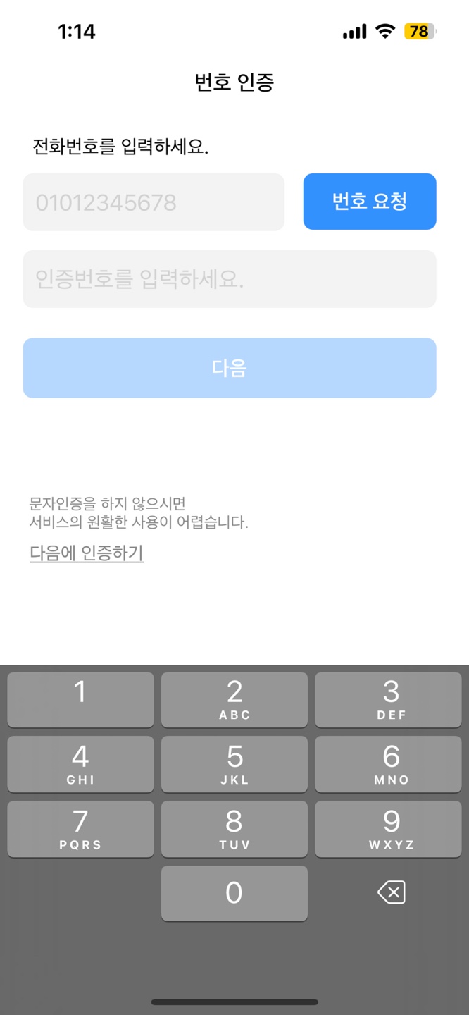 초기 페이지에서 전화번호 인증을 통해 인증을 통해 신원을 확인하는 것이 바람직하다 생각한다