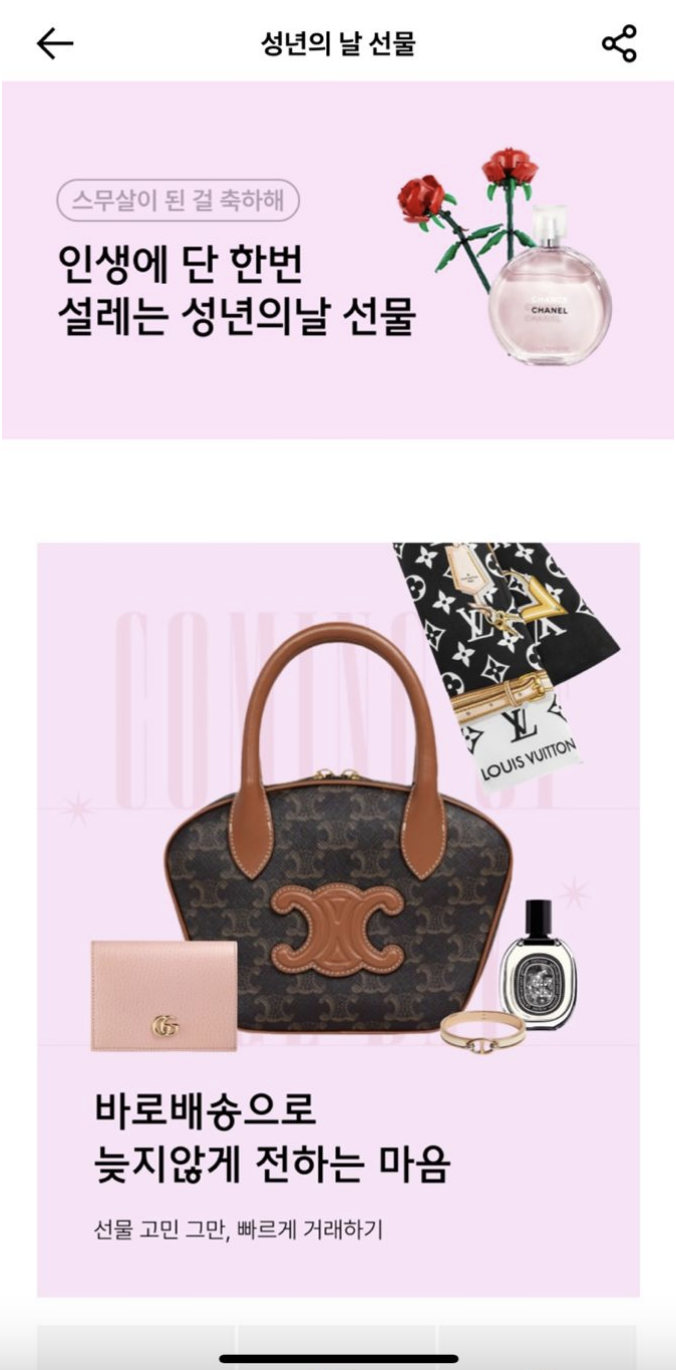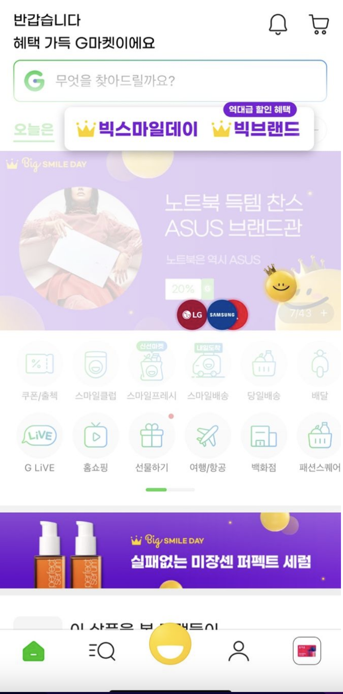- 중단 버튼 메뉴가 배너의 크기가 너무 커서 4개만 눈에 들어온다 크림 같은 경우에는 판매에 직결되는 중단 메뉴가 스크롤을 하지 않더라도 한눈에 보인다