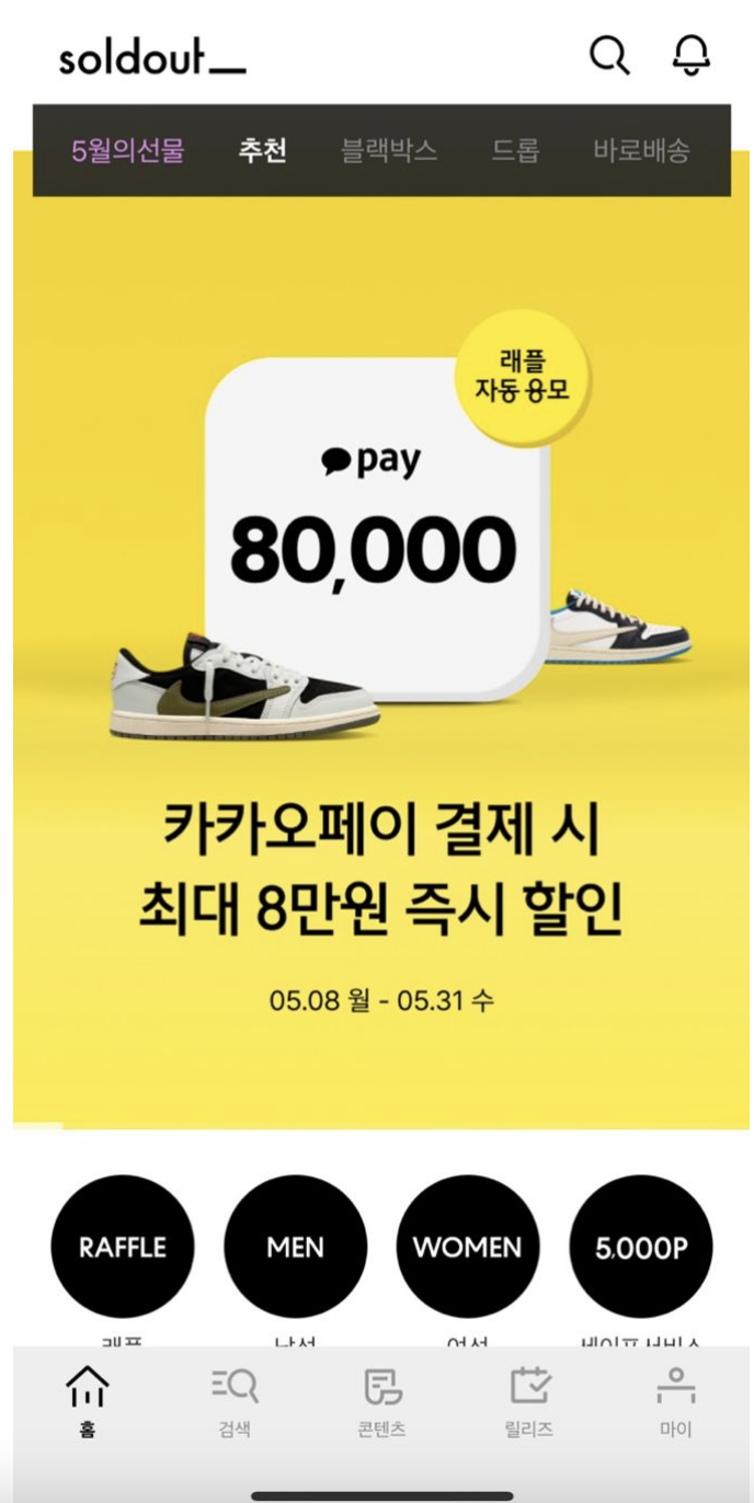 솔드아웃의 경우 크림과 다르게 메뉴 버튼 전체가 한눈에 들어오지 않는다. 보이지 않는 메뉴에는 수익에 관련이 있는 하이엔드 브랜드와 할인하는 상품의 품목들이 있어서 사용자의 입장에서 놓치기 쉬울 수 있어서 상단 배너 크기를 줄이거나 크림 앱 처럼 버튼의 크기를 줄여서 버튼을 한눈에 볼 수 있도록 설정하는게 좋다