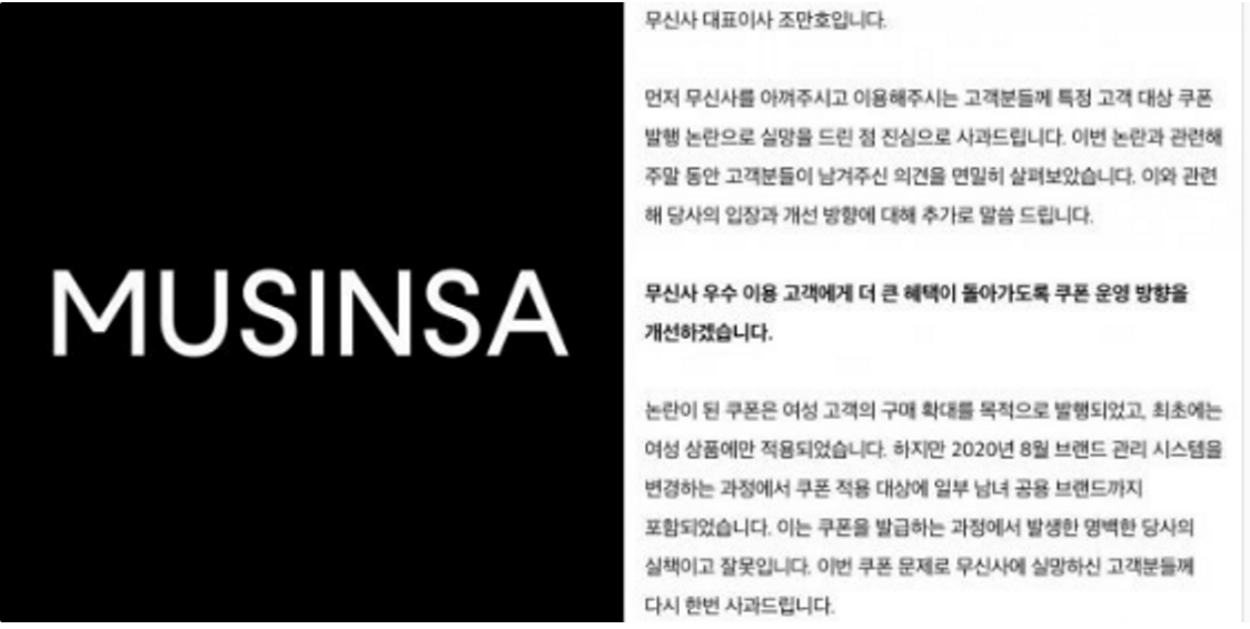 모기업인 무신사의 대처 방법은 진정성 있는 대표의 사과와 쿠폰 배포를 통해 이루어졌다