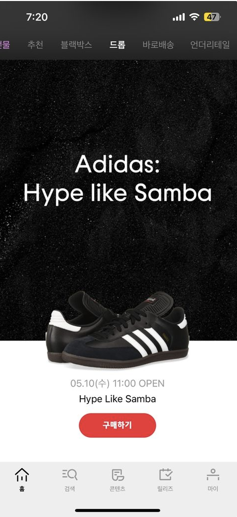 모기업의 무신사처럼 랜덤 %쿠폰이나 포인트를 지급하는 프로모션 현재 진행하고 있는 특정 상품의 리셀이 붙지 않은 원가로 상품을 판매하는 드롭과 같이 공격적인 서비스 전략이 필요하다.