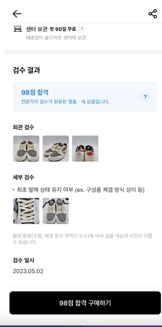 - 솔드아웃의 핵심 기능 98점 상품에 대한 홍보와 정보가 부족하고 사용자의 입장에서 98점 혜택을 상품의 화면에 들어가지 않는 이상 알수가 없다. 솔드아웃의 신뢰도가 떨어진 가품 논란 이후 솔드아웃의 검수 시스템의 강화를 98점 상품으로 보여주려 했다. 하지만 이 기능은 메인 탭에도 상단 메뉴에도 보이지 않고 상품의 뷰에 도달한 후 스와이프를 내려야 보인다