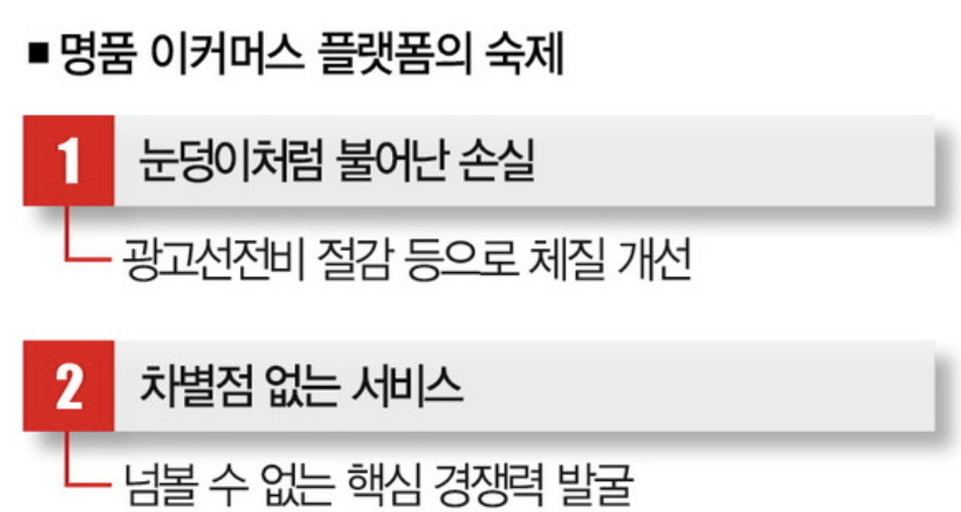 손실이 눈덩이처럼 커진 이유가 뭘까. 서용구 숙명여대(경영학) 교수는 "팬데믹 기간엔 테크기업이 프리미엄을 누렸지만. 엔데믹(풍토병·endemic)으로 오프라인 활동이 가능해지면서 이커머스 전체 성장률이 떨어지고, 프리미엄도 사라졌다"면서 "명품 이커머스 플랫폼을 바라보던 환상이 사실상 꺾인 셈"이라고 분석했다.