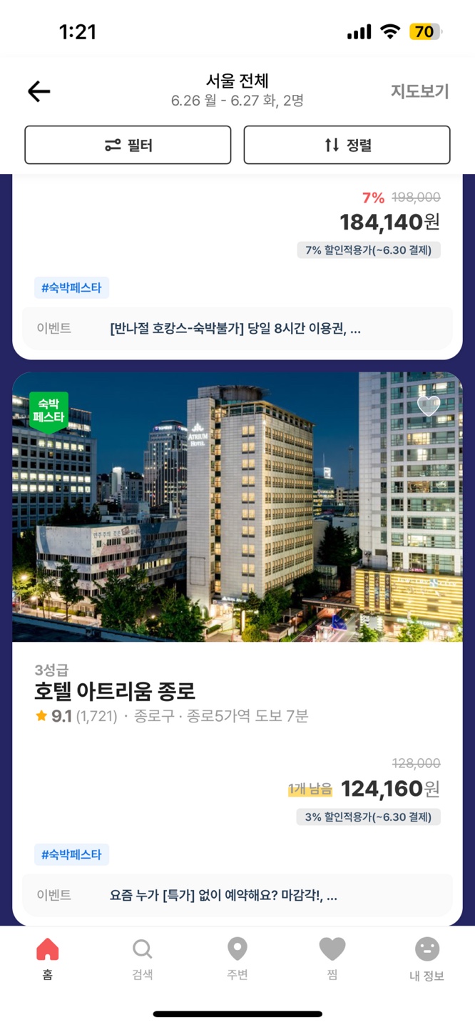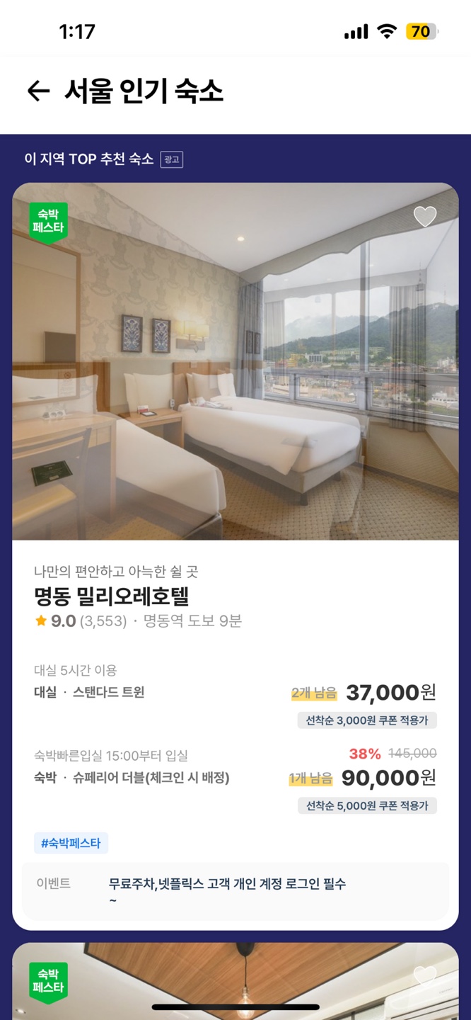 하지만 여기어때의 경우 서울의 인기숙소Hot으로 들어가게 되거나 일반적으로 View로 들어가서 Sorting을 설정하거나 필터를 해도 상단광고가 고정되어 불편함이 있다