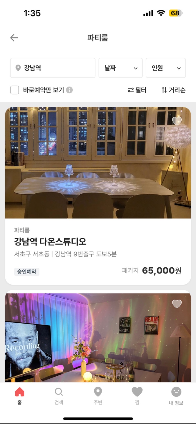 Scroll 시 상단에 정렬 버튼이 나오는 것을 알 수 있는데 기존 검색 결과 화면에서는 상단에 필터 종류에 대한 태그리스트가 있으며 정렬의 버튼은 상대적으로 작아서 필터가 먼저 눈에 들어오는 것을 알 수 있다
