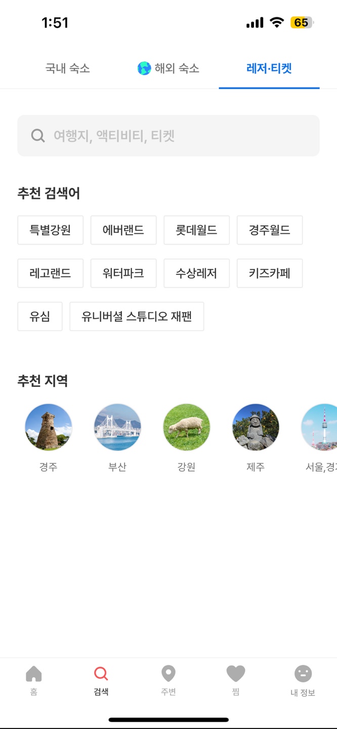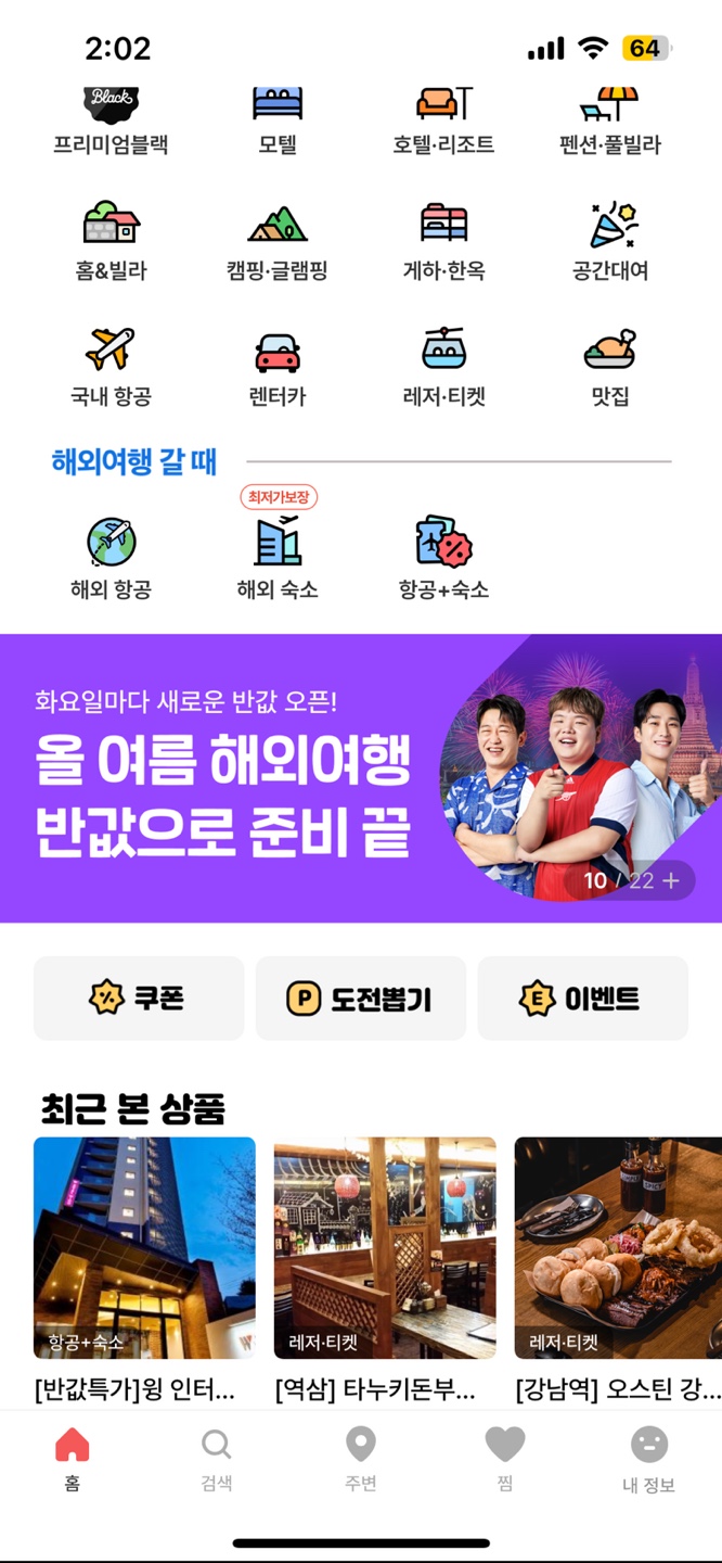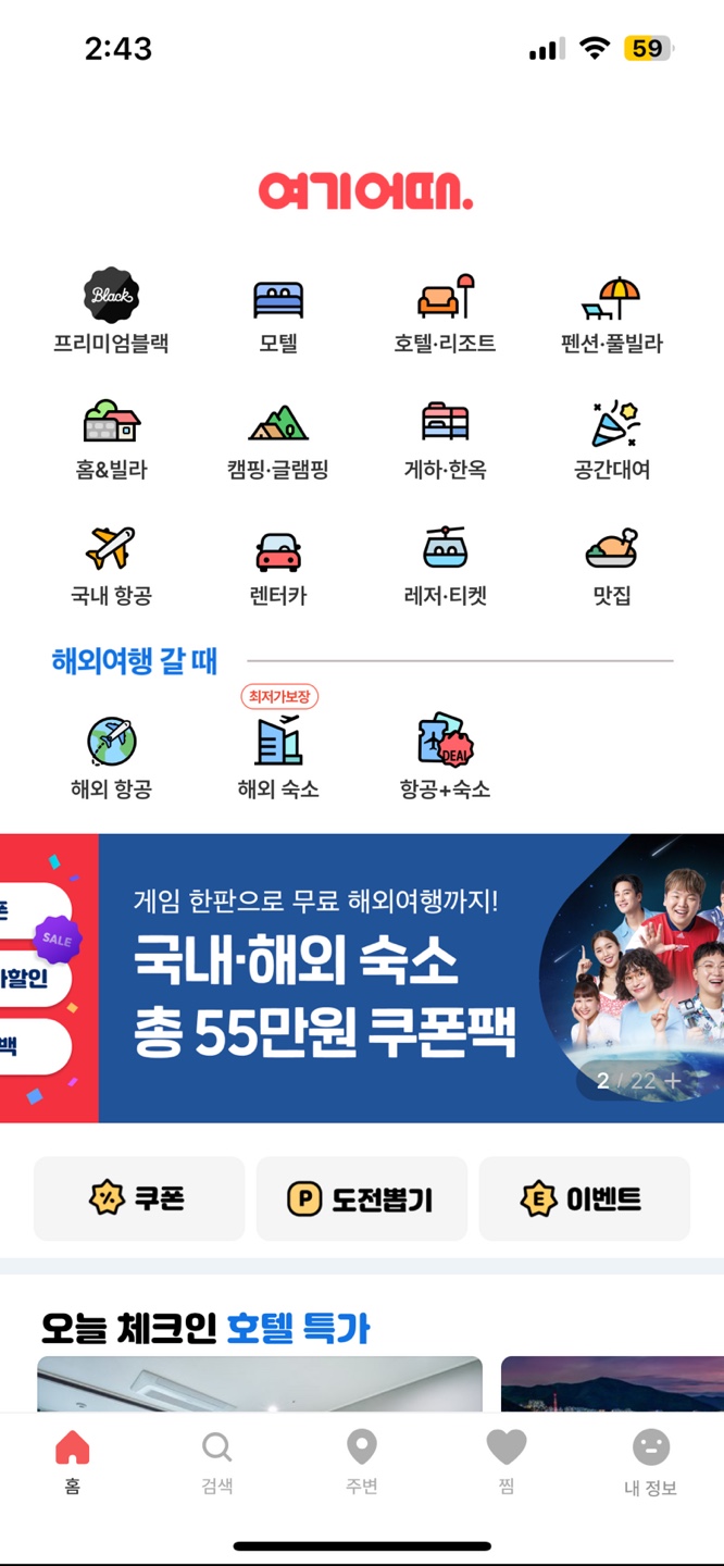 - 국내 숙박, 레저, 공간대여, 국내/해외 항공권, 맛집 등 여행에 필요한 전 과정을 한 번에 준비할 수 있는 여행/여가 플랫폼이다.