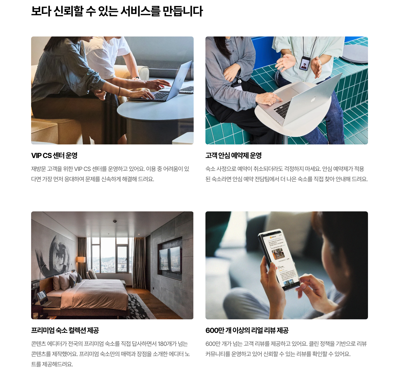 - VIP CS 센터운영, 고객 안심 예약제 운영, 프리미엄 숙소 컬렉션 제공, 리얼 리뷰 제공 등 신뢰할 수 있는 서비스를 제공하도록 노력한다