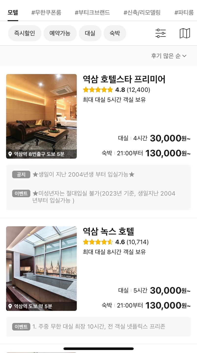 야놀자의 경우 필터를 설정하면 상단 광고의 정보를 보지 않을 수 있다.
