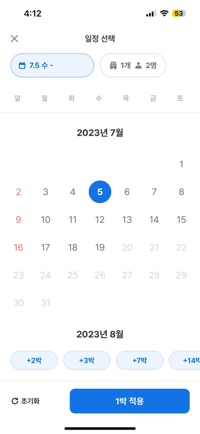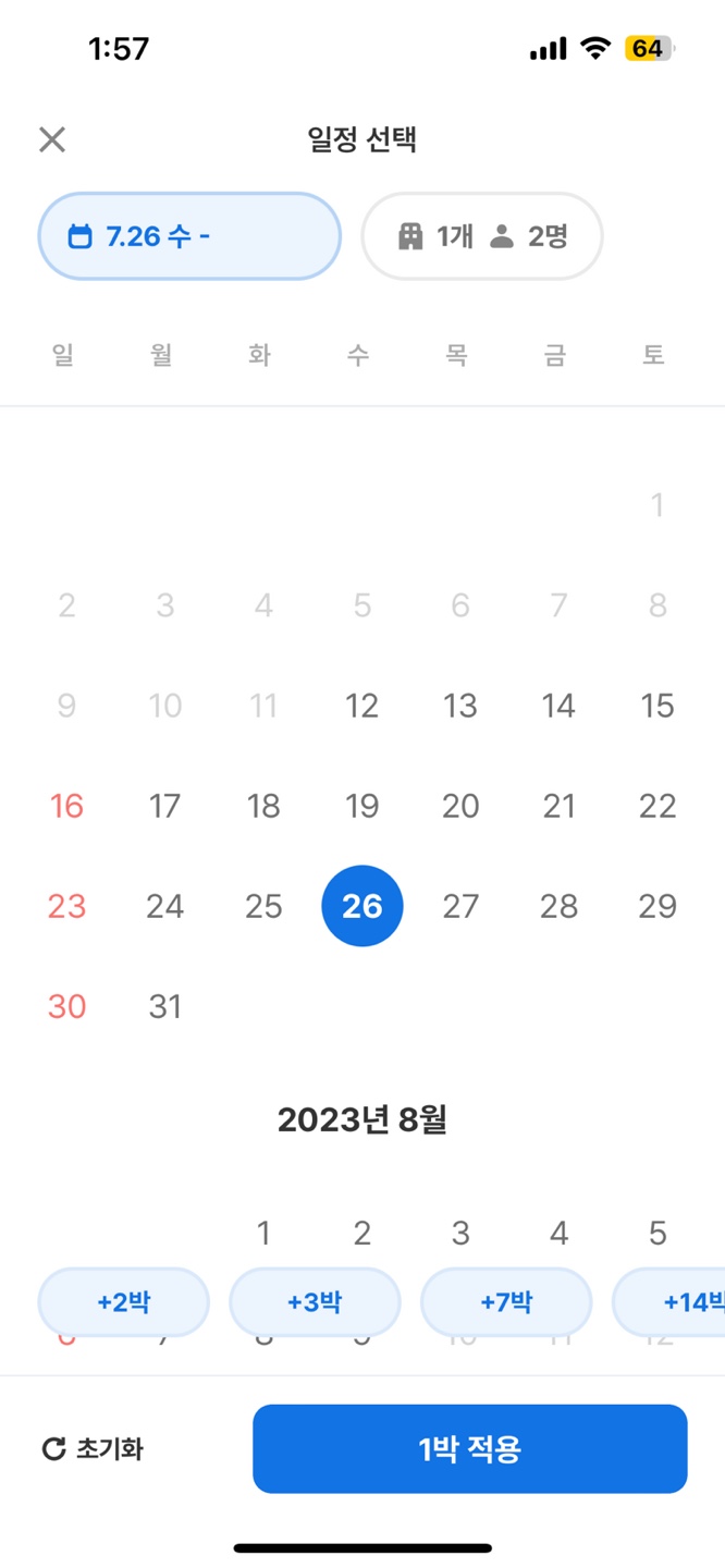 해외 숙소 시 14일 기준 전 날짜는 설정을 하지 못한다 14일을 한번에 선택하지 않는 경우도 있기 때문에 2주 이후에 비활성화는 방식은 좋지 않아 보인다