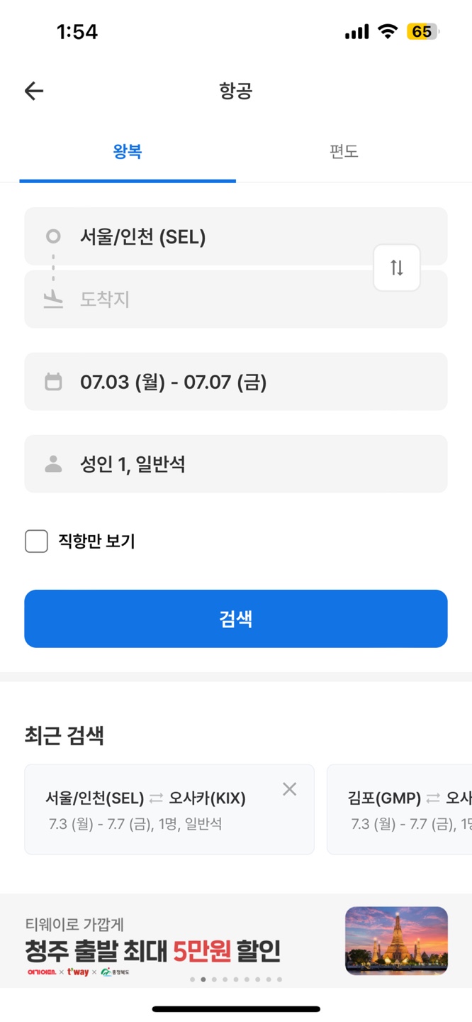 왼쪽과 오른쪽의 View는 홈 화면에서 국내항공, 해외항공 버튼을 눌러서 들어오게 된 View이다