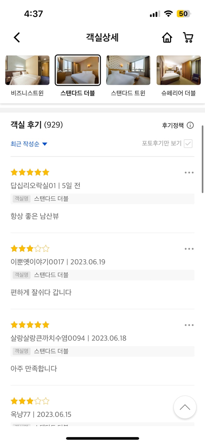 여기어때의 경우 객실마다의 리뷰는 없고 통합리뷰가 있어서 User가 원하는 객실의 리뷰를 보고 싶으면 한번 더 찾아봐야하는 상황이 발생한다