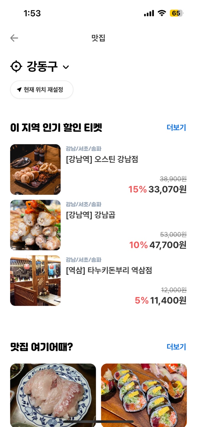상단에서 위치를 강동구로 설정했지만 하단에 인기 할인 티켓의 View는 강남역, 역삼역으로 설정되어 있다