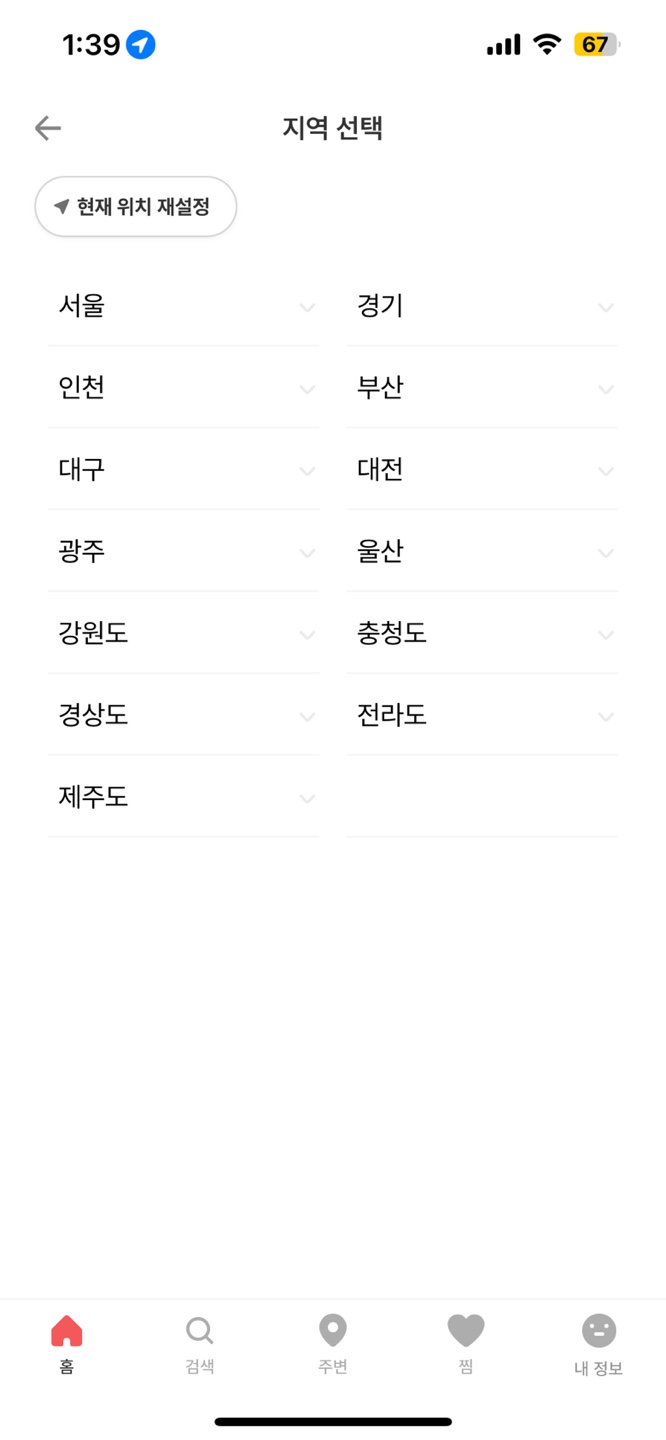 지역선택 화면을 접근했을 때 권한의 여부를 물어보는데 한번 허용으로 하는 경우 현재위치 재설정 버튼을 누르지 않는다면 기본으로 설정된 위치가 보인다