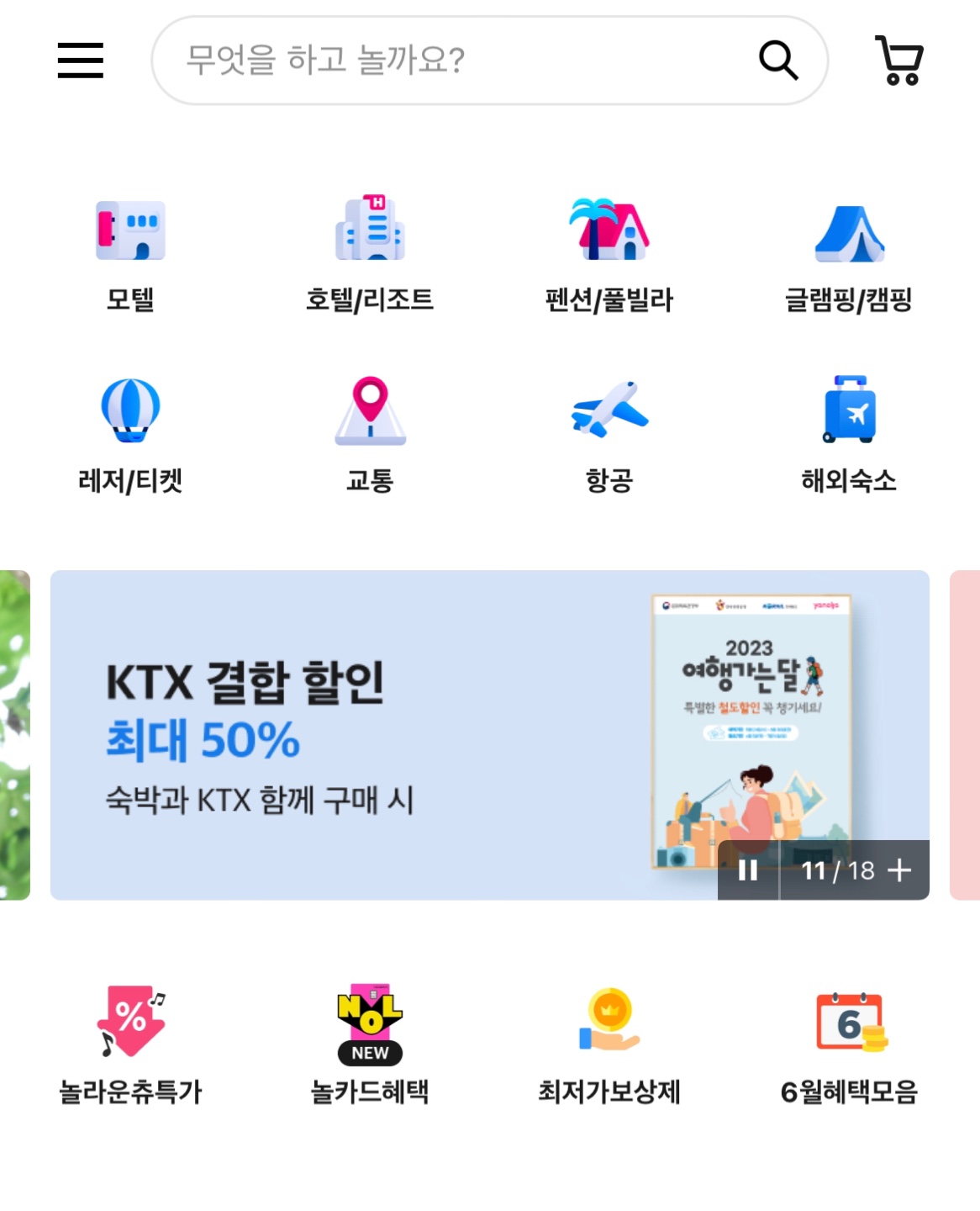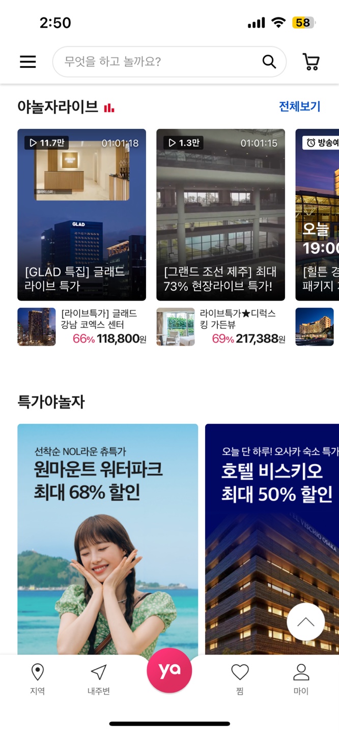 야놀자의 경우(왼쪽) 장바구니가 홈 화면에도 있는 것을 알 수 있다 구매전 장바구니 기능을 통해 담아두고 비교하여 서비스 이용이 가능하다