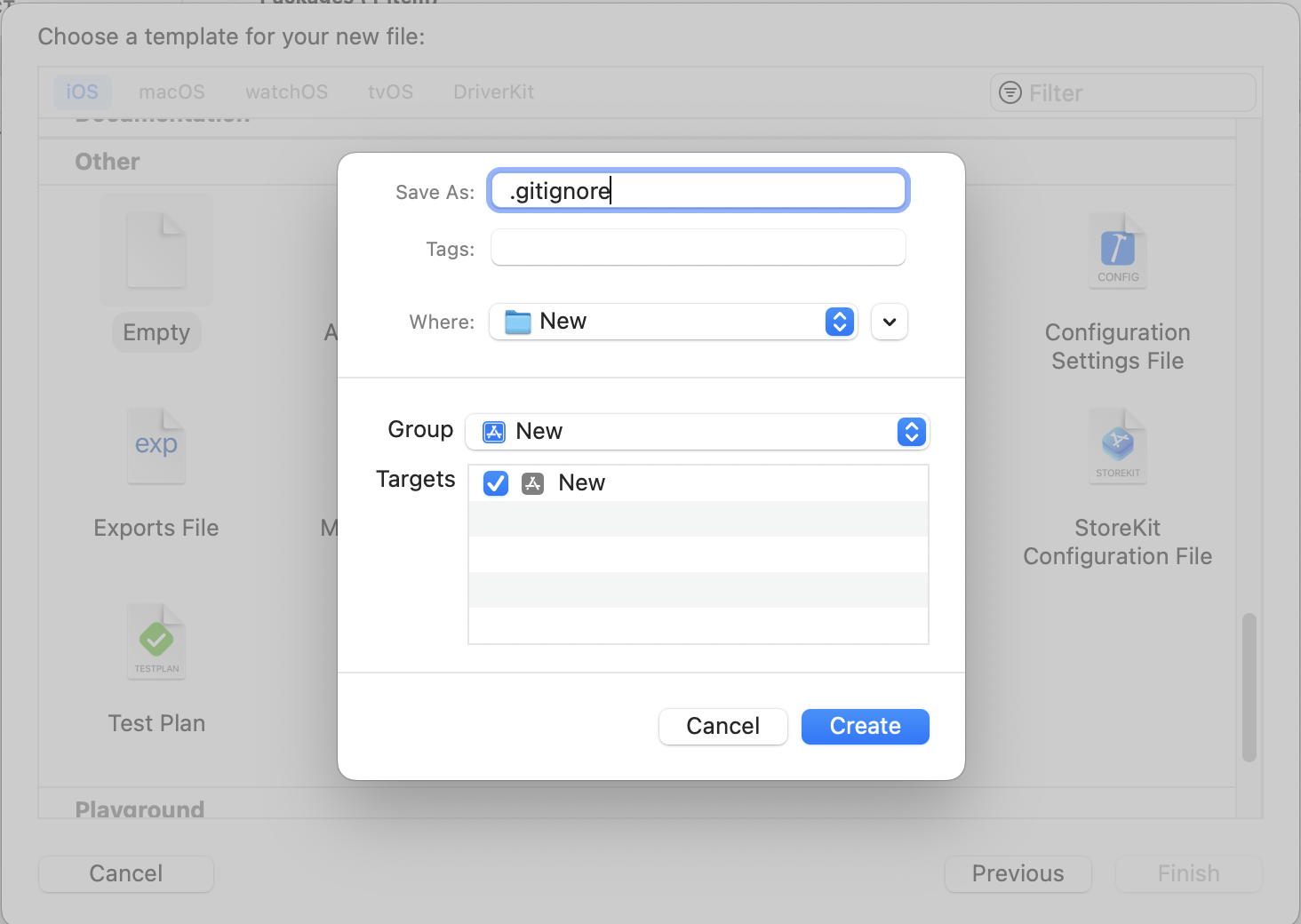 2. 파일명을 .gitignore로 하고 create 눌러준다