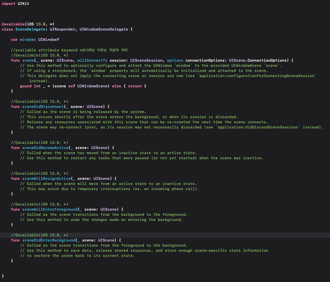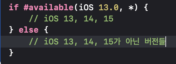 위의 예시처럼 iOS 13을 포함한 그 이상(*)의 버전에서만 scene을 호출 할 수 있다