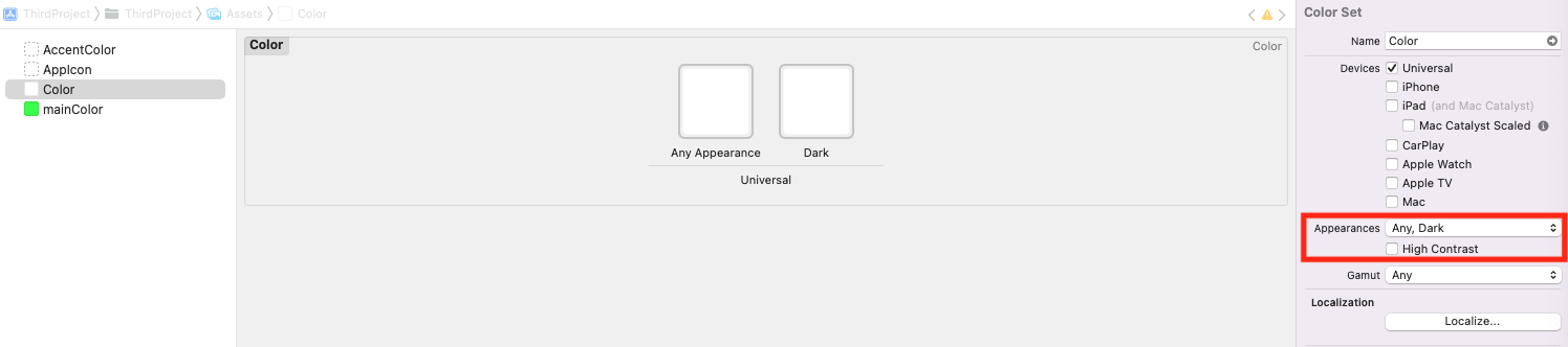 버전이 13보다 낮으면 다크 모드를 지정할 수 없기 때문에 Any Appearance의 Color가 나온다