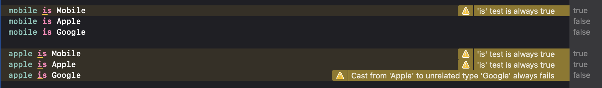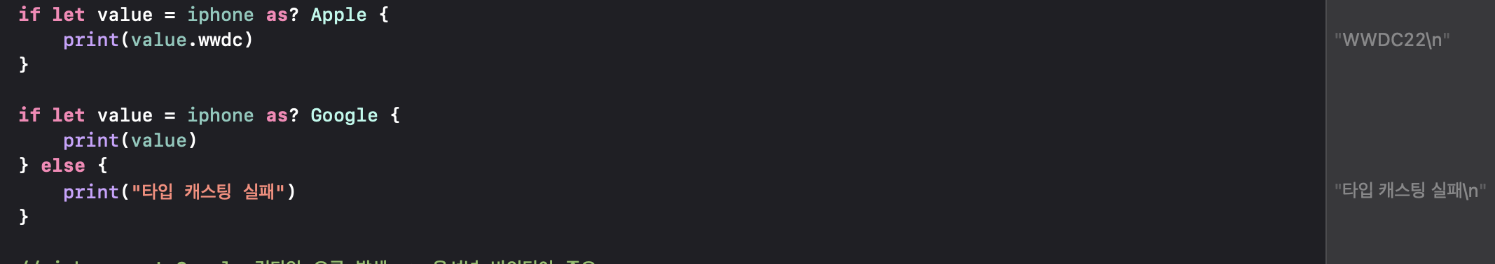 as? 의 경우 다운캐스팅 성공시 인스턴스 반환하는 것을 볼 수 있고 실패시 nil 반환을 하는 것을 볼 수 있다